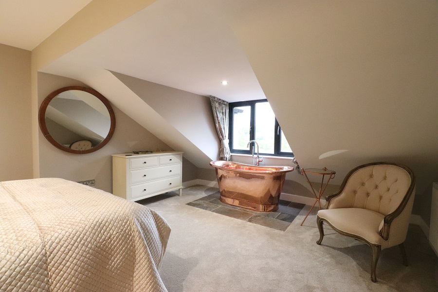 The romantic first floor bedroom has a wall of windows to take in the stunning view, snuggle in the bed and watch the stars twinkling above the water below. Soak away the stresses of the day in the copper bath whilst enjoying a glass of bubbly. There is an en-suite shower room with double shower cubicle.